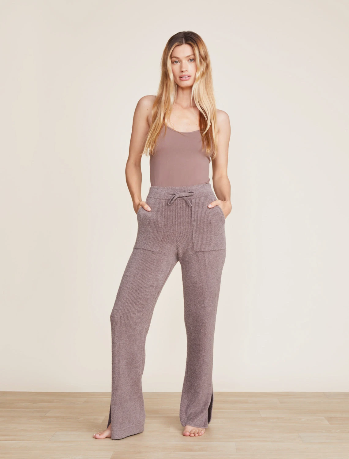 From our Day to Night Collection ™, this mid-rise pant has a semi-fitted waist and hip, flowing into a relaxed straight leg. Features include adjustable drawstrings, high side slits and pinched seams along the ribbed finish with two patch pockets. Pairs perfectly with our CozyChic Lite Waist Tie Cardigan. Model is 5′ 7″ and is wearing a size XS. Inseam Length: 29.75″.