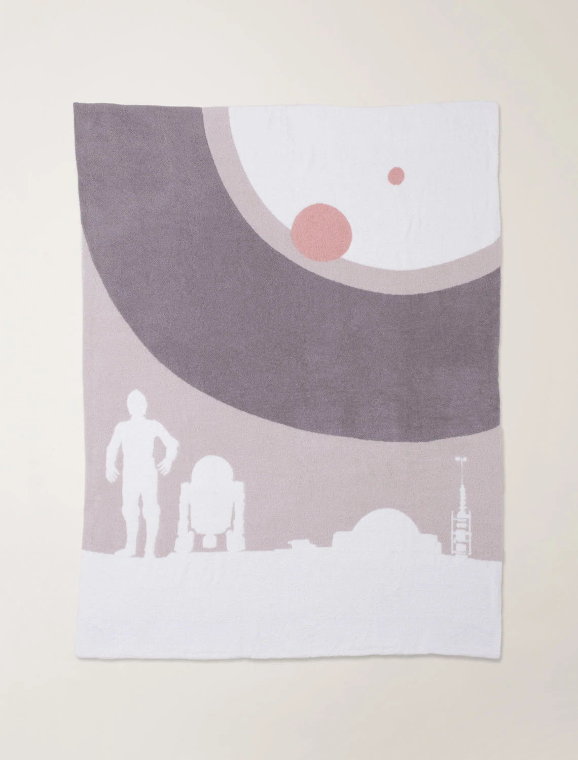 The nostalgic landscape on this ultra-plush throw depicts the warm desert sands of Tatooine from Star Wars Episode IV: A New Hope™. This moment captures C-3PO™ and R2-D2™ gazing out at the iconic binary sunset. Packaged and tied with custom Star Wars ribbon, this item is perfect for gifting in any galaxy.