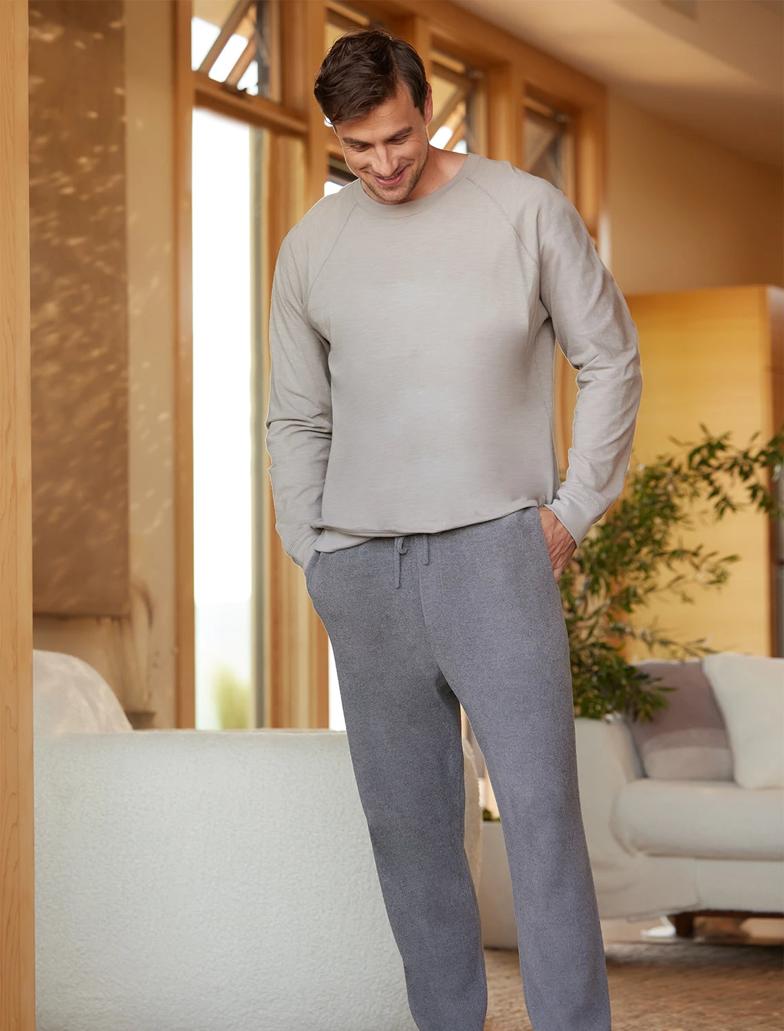 This pant offers maximum comfort with its ribbed leg cuff opening and waistband, drawcords for adjusting, multiple pocts and knit construction that is more substantial than jersey. Perfect for any active lifestyle. Model is 6’1″ and wearing a size L.