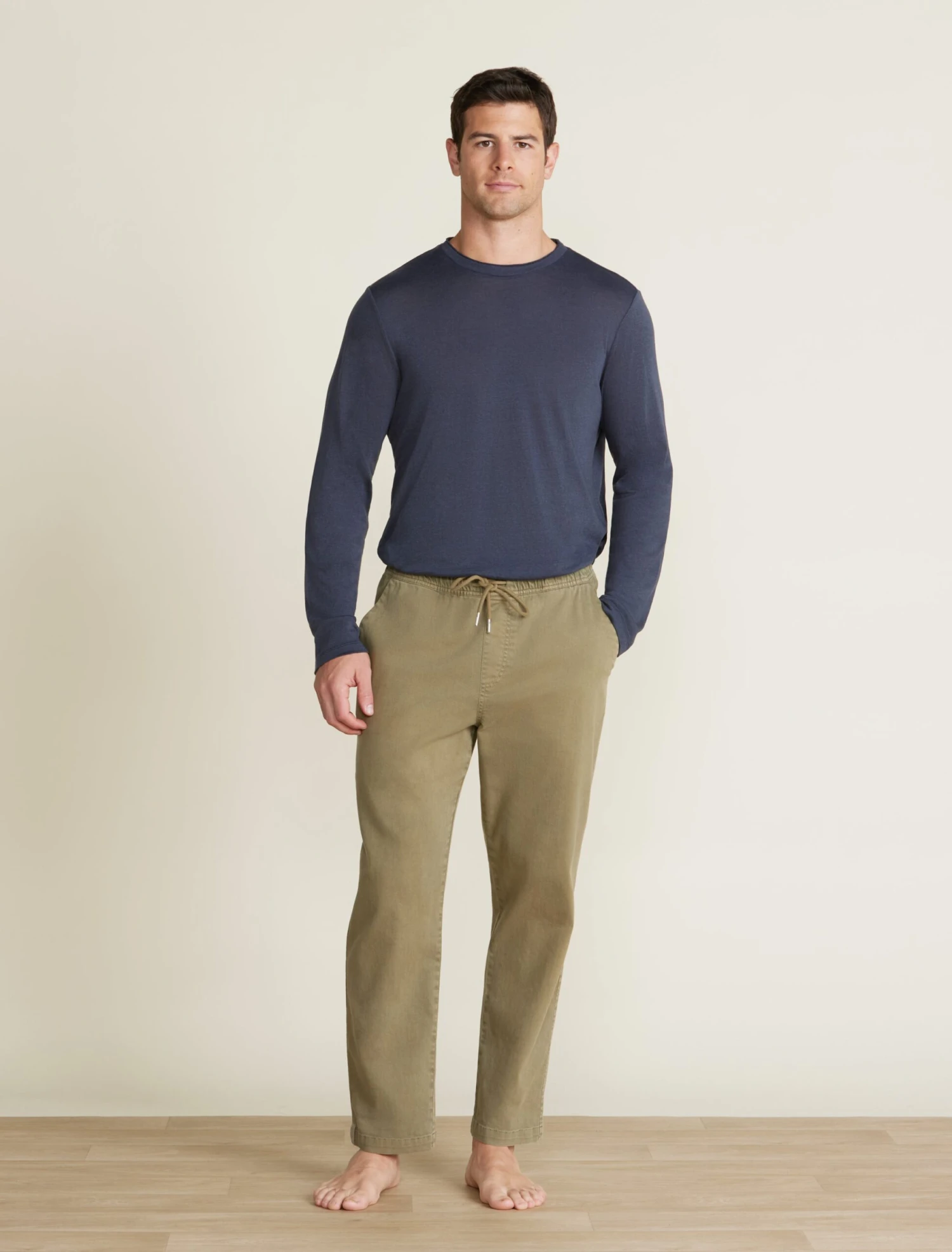 From our Barefoot Dreams Malibu Collection®, enhance your wardrobe with our Twill Relaxed Pants. They feature a pull-on fit with an elasticated waistband, tunnel drawstring with metal tips, faux fly stitch detail, and a back patch pocket. This classic design is perfect for everyday wear. Model is 6′ 2″ and is wearing a Size L.