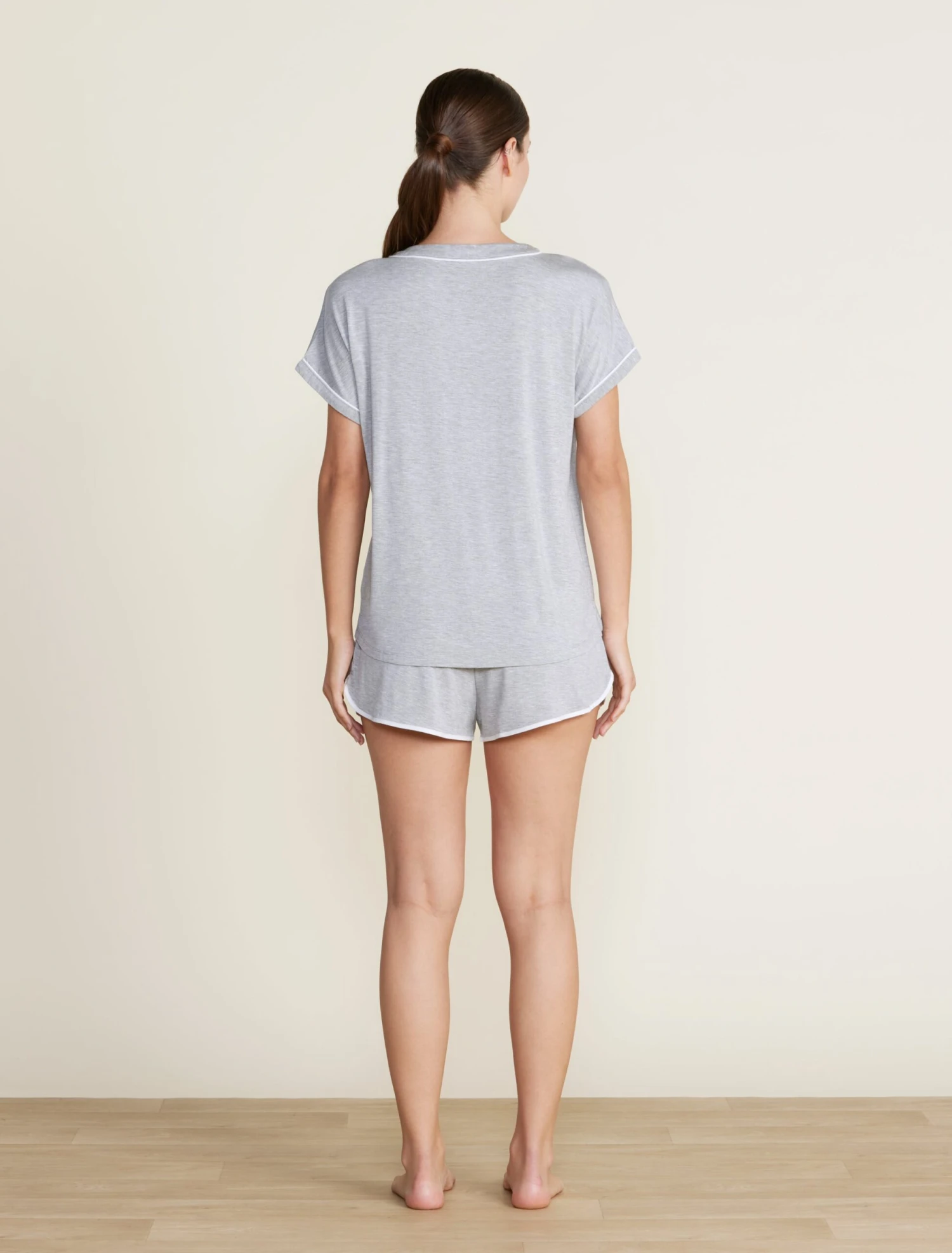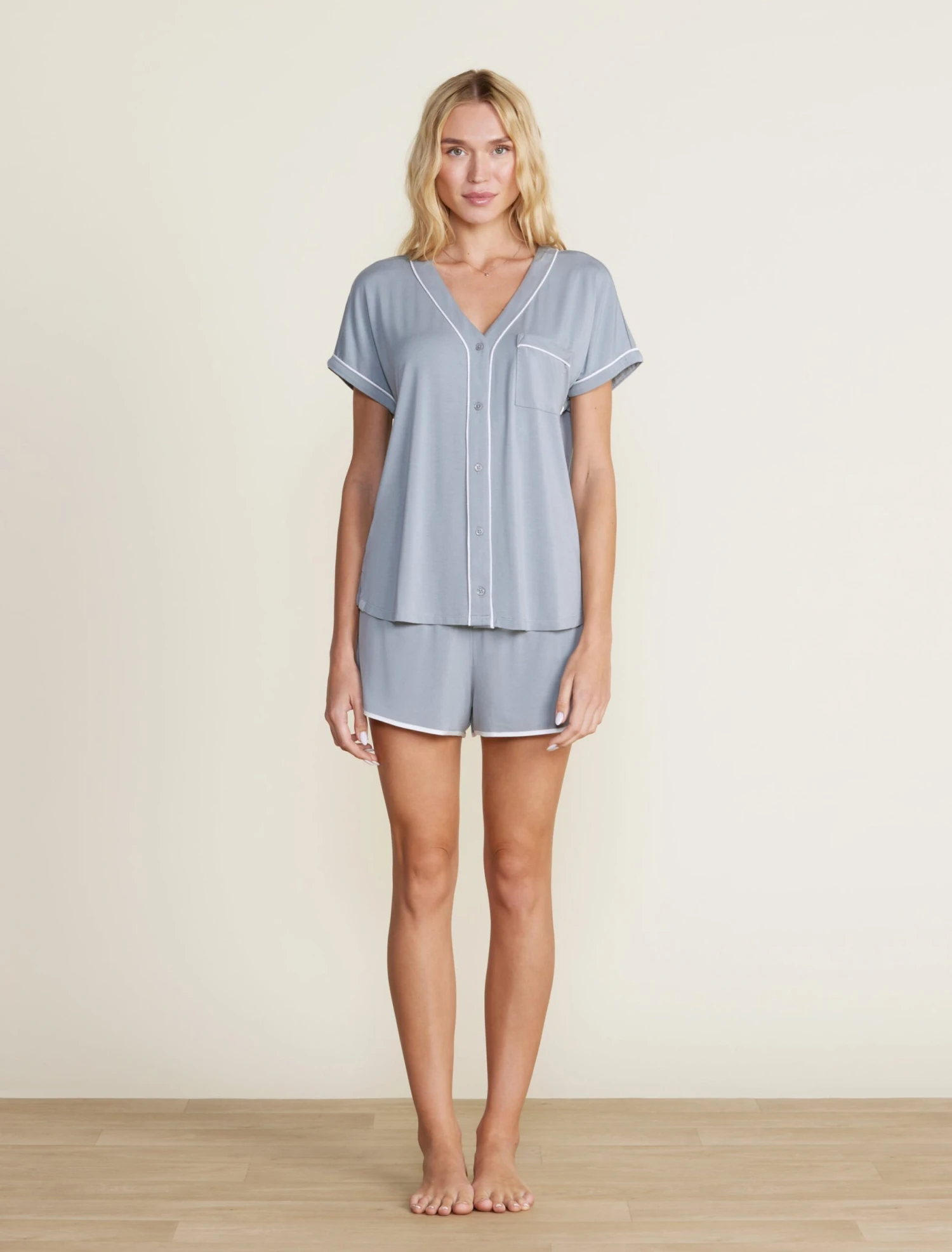 From our Barefoot Dreams Malibu Collection®, stay comfortable and stylish while lounging in our Soft Jersey Piped Lounge Set. Featuring a button-down dolman style tee with contrast piping and a patch pocket, and elasticated pull-on shorts with contrast binding at the hemline. Pairs beautifully with the Malibu Collection® Soft Jersey Piped Robe. Models are between 5’9″ and 5’11” and wearing a size Small.